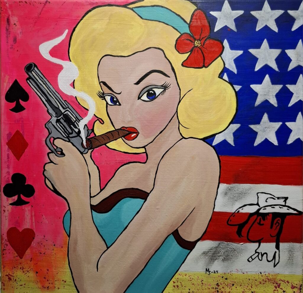 „LADY KNALLBONBON“ Acryl auf Leinwand, individuelle Farben,40x40cm Unikatcharakter, signiert. Es hinterfragt traditionelle Geschlechterrollen und bietet eine starke, unkonventionelle Darstellung der Frau.