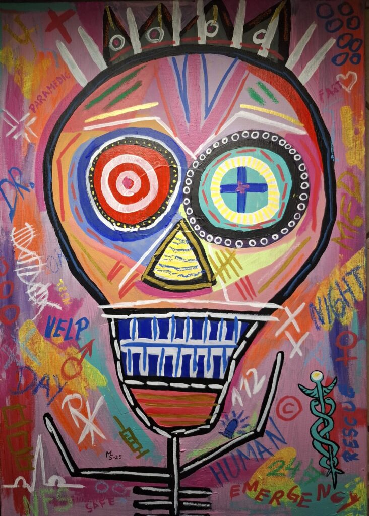 „Paramedic“ ist inspiriert von den Werken Jean-Michel Basquiat’s. Mit medizinische und humanitäre Symbolen und Textfragmenten, aus Themen wie Rettungsdienst und Medizin . 50×70 cm, Acryl auf Leinwand,individuelle Farben,Unikat, signiert.