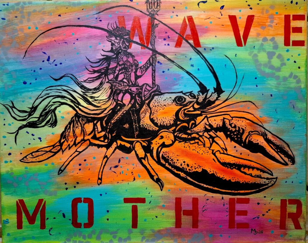“ WAVE MOTHER „, 40x50cm, Acryl auf Leinwand, signiert, Unikat Charakter, Herrscherin über die Gezeiten und das Meer, mit ihrem Hummer.