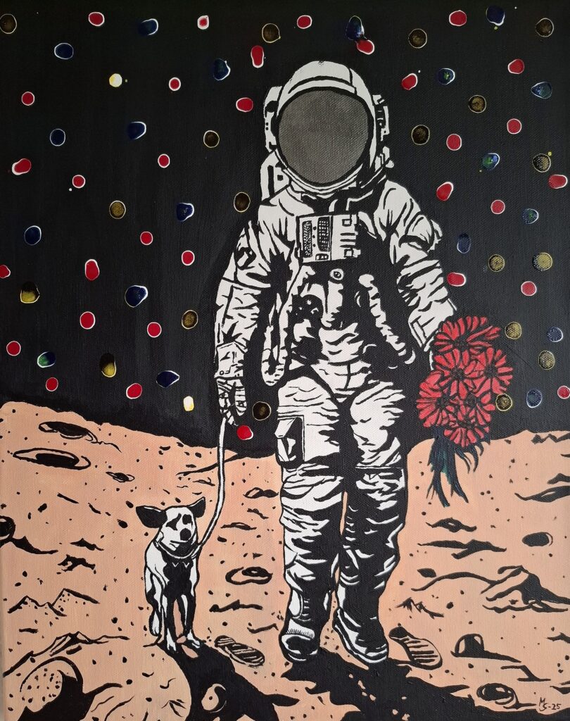 Acryl auf Leinwand, individuelle Farben 40x50cm Unikatcharakter, signiert. Die Mondlandung als ein historisches Ereignis, zeigt das Bild eine persönlichere Reise, bei der man seine Wurzeln und Gefährten nicht vergisst.