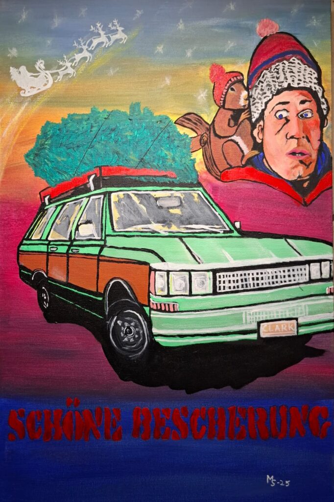 Malerei, die den Weihnachtsklassiker „Schöne Bescherung“ („National Lampoon’s Christmas Vacation“, 1989) mit Chevy Chase in der Hauptrolle des Clark Griswold darstellt. 40x60cm, Acryl auf Leinwand,individuelle Farben,Unikat, signiert.