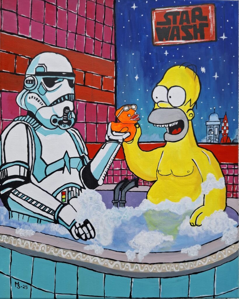 “ STAR WASH „, 40x50cm, Acryl auf Leinwand, signiert, Unikat Charakter, Homer Simpson und ein Stormtrooper sitzen gemeinsam in der Badewanne.