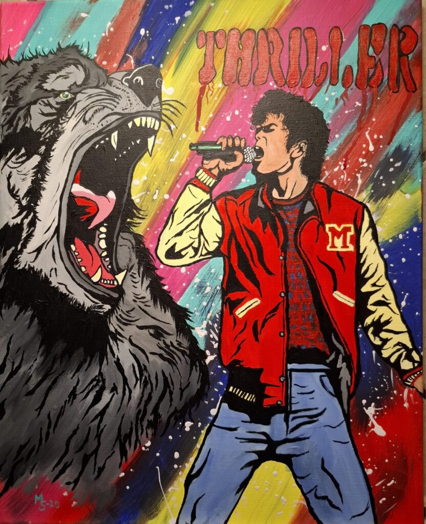 „THRILLER“ Acryl auf Leinwand, individuelle Farben,40x50cm Unikatcharakter, signiert. Michael Jackson aus dem Kult Video „THRILLER “ mit Werwolf. Erschienen 1982.