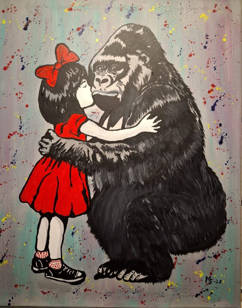 „YOUNG FRIENDS 2 „, Mädchen mit Gorilla Bild einer kleinen Serie mit Kindern und ihren Tierfreunden. Inspiriert von „Banksy“ und seinen Streetart Motiven. 40×50 cm, Acryl auf Leinwand,individuelle Farben,Unikat, signiert.